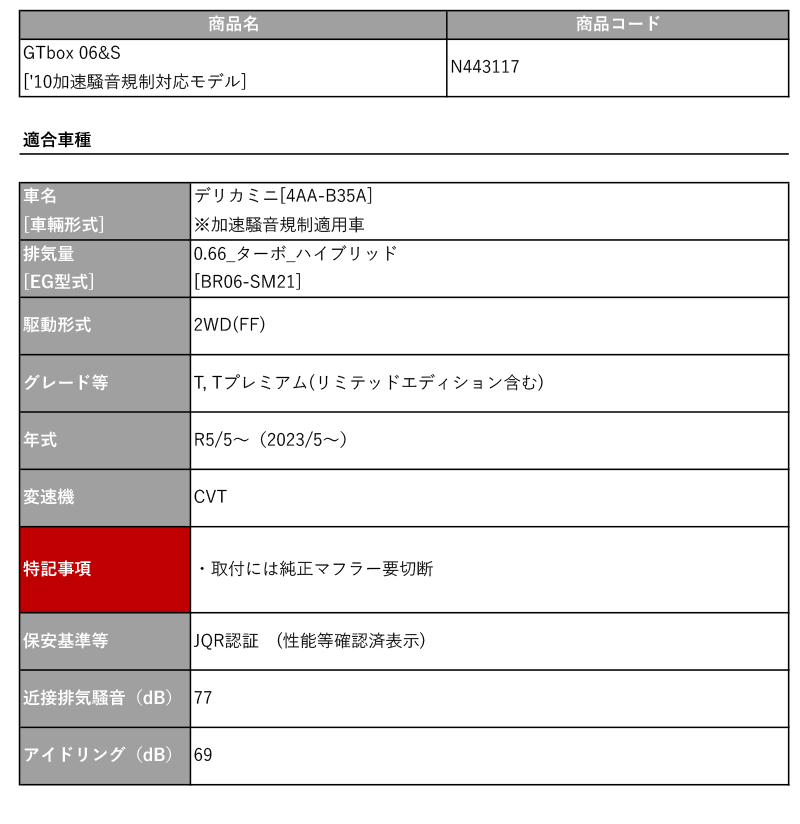 ■商品コードN443117 ■メーカー柿本/カキモト ■商品名GTbox 06&S ■自動車メーカーMITSUBISHI ■車名デリカミニ ■車輛形式5AA-B34A ■車種備考 ■車両マフラー規制加速騒音規制適用車 ■排気量0.66 NA ハイブリッド ■EG型式BR06-SM21 ■駆動形式2WD(FF) ■グレード等G/Gプレミアム ■年式2023/5〜 ■変速機CVT ■特記事項・取付には...